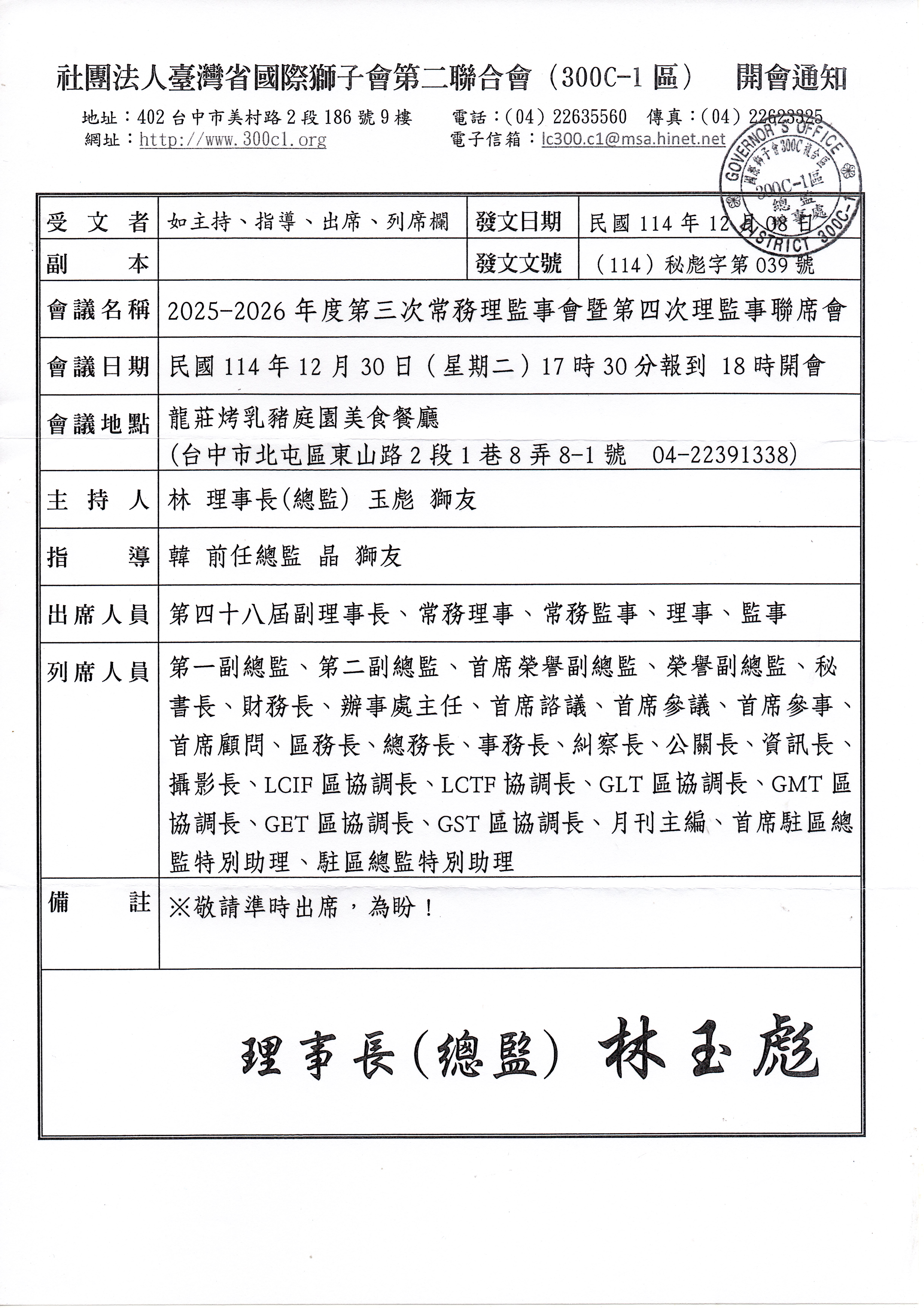 | 2025-11-04 | (114)秘標字第037號 | 國際獅子會 300C 複合舉辦 202 5-2026年度「GMA 引導師培訓 研習會」 | 下載 |