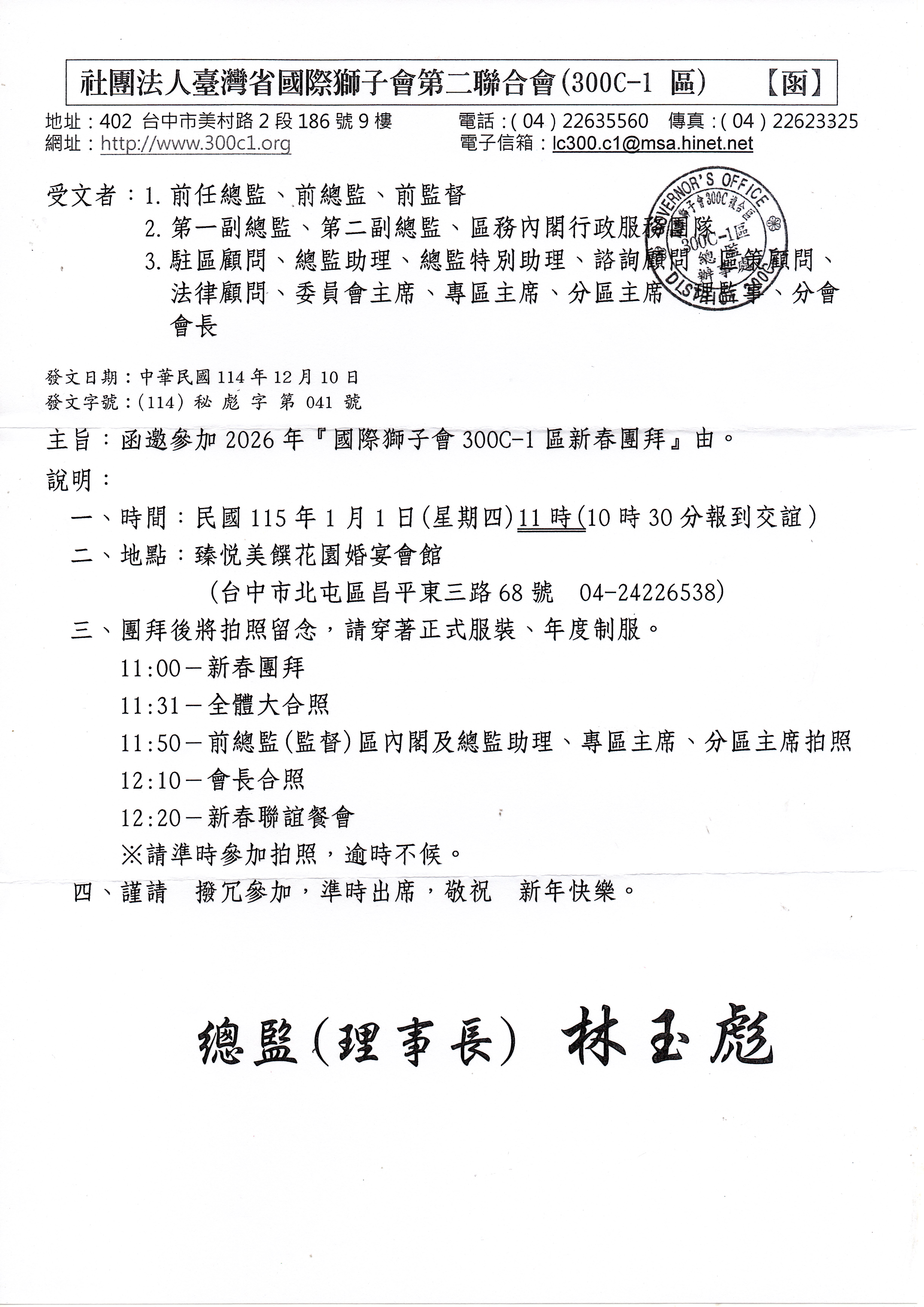 | 2025-12-10 | (114)秘標字第041號 | 函邀 參加 2026年 國際獅子會 300C-1區 新春團拜 | 下載 |